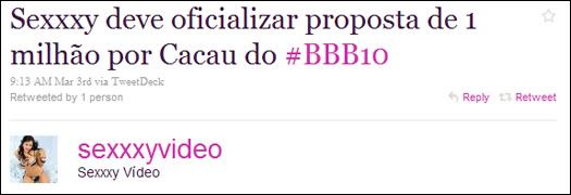 Ontem a produtora de filmes pornográficos Sexxxy divulgou em seu twitter oficial o interesse em contratar a ex-bbb Cacau. A Sexxxy prometeu 1 miilhão de reais caso Cacau aceite estrelar um de seus filmes.